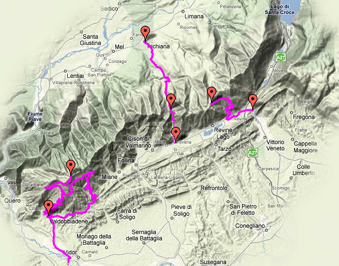 Dalla grande pianura, piatta e in bolla, piena di case, capannoni, strade, traffico, ma piena pure di oasi fantastiche lungo il corso dei fiumi di risorgiva, il Sile in particolare, alla complessa articolazione collinare nettamente separata in due parti dal grande fiume Piave, alle montagne "montagne", montagne vere anche se classificate come prealpi. E per essere sicuri che si tratta di montagne "vere" basta solo chiederlo ad un qualsiasi ciclista.
