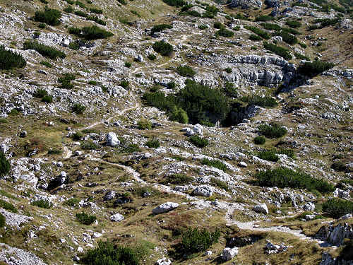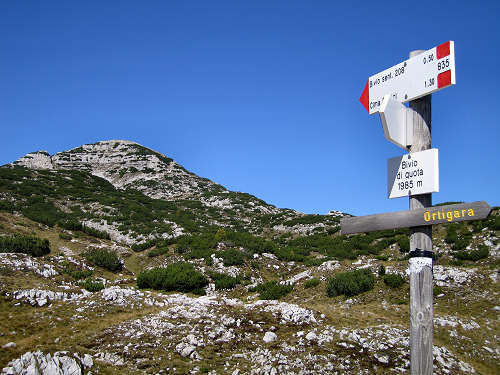 Il bivio Italia, proprio al cospetto di Cima XII sulla grande depressione carsica tra la Cima Corno di Campo Verde ed i Campigoletti, è lo snodo tra la val Galmarara, la val Trentin sotto il Portule e Cima XI-Ortigara.