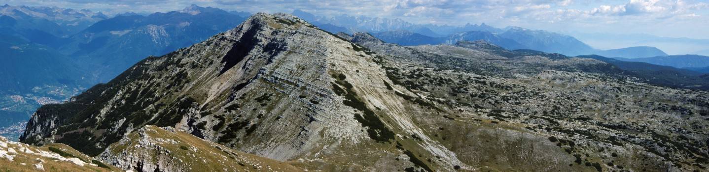 Sulla sinistra, in basso, il solco della Valsugana, all'orizzonte la Catena dei Lagorai, Cima d'Asta, le Pale di San Martino, le Dolomiti Bellunesi e, in primo piano in basso a destra, Campo Gallina, sede del comando AustroUngarico.