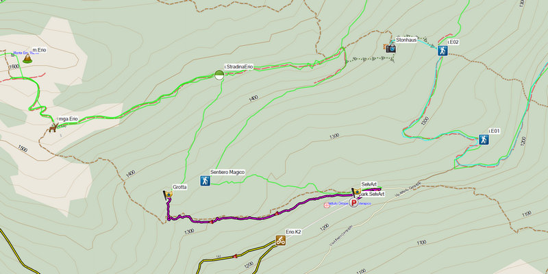 - Continuare la salita per il sentiero che prosegue nel bosco e raggiungere la malga Erio ed anche la cima del monte Erio. La discesa si può fare seguendo la stradina forestale, percorso un po' più lungo, e riprendere il Sentiero Magico.