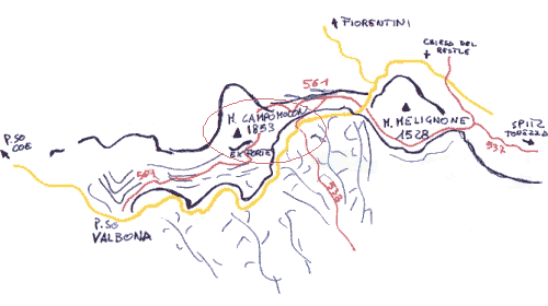 Per chi preferisce avvicinarsi godendo di bellissimi sentieri, conviene parcheggiare alla chiesetta del p.so Restle e prendere il sentiero che supera tutta la dorsale del Melignone, della Riva dei Mercanti e porta in cima al Campomolon (segn. cai 561) (1 ora).
