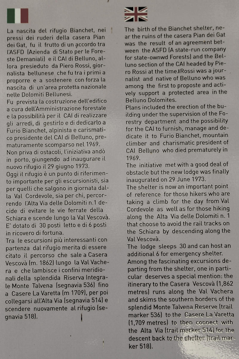 Il rifugio Furio Bianchet al Pian dei Gat (m.1.300), sul versante nord della Schiara (m.2.563), si trova in Comune di Sedico e si raggiunge partendo dal fondovalle del Cordevole tra le località di 'La Stanga' e di 'La Muda', chiari riferimenti ai luoghi di sosta delle diligenze lungo la strada per Agordo.