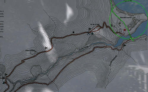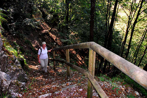 Si risale subito accanto alle attrezzature sportive (attualmente in abbandono) e si prende il sentiero che inizia subito a salire con decisione verso la valle.