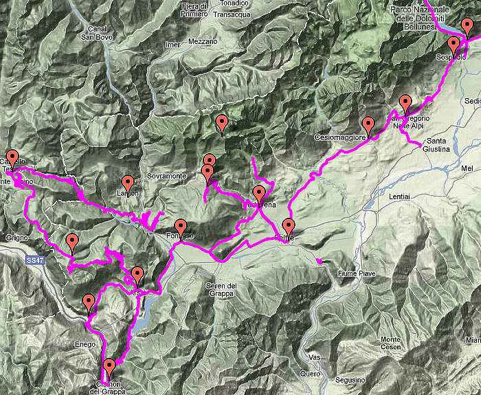 - le salite al Monte Grappa per la classica "dorsale nord" da Caupo, oppure la durissima salita per la valle di Seren e Chiesa Nuova San Luigi;