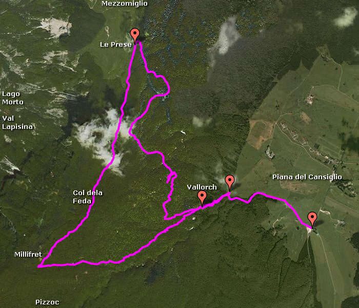Escursione per buona parte tra le riserve naturali biogenetiche Piaie Longhe, Millifret, Pian di Parrocchia, Campo di Mezzo, gestite da Veneto Agricoltura e Forestale.