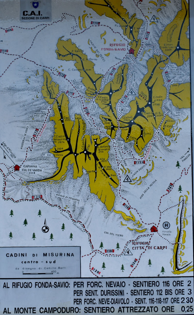 Una articolata catena rocciosa che da qui par quasi inacessibile. Infatti per raggiungere il rifugio Fonda Savio, sul versante nord, si devono affrontare sentieri impegnativi, lunghe e faticose risalite di canaloni e qualche tratto attrezzato.