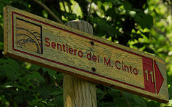 Dopo larghi curvoni con panoramiche sul monte di Cinto, sulla sinistra si dirama un sentiero (cartelli indicatori) che aggira tutto il versante ovest del monte, restando un po' alto rispetto al piano.
