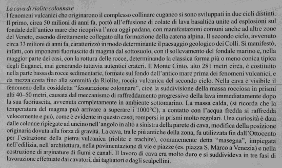 La visita alla cava, evidenziata da pannelli divulgativi dell'Ente Parco Colli Euganei, è molto suggestiva e impressionano quelle colonne solidificate, quasi verticali, di lava.