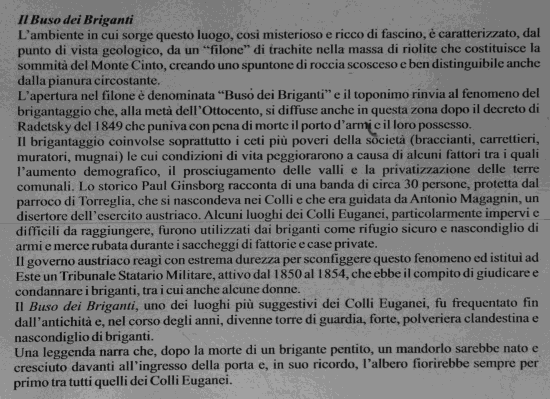 Da qui una breve deviazione (verso sinistra, indicazioni) conduce al Buso dei Briganti, uno dei luoghi più suggestivi dei Colli Euganei.