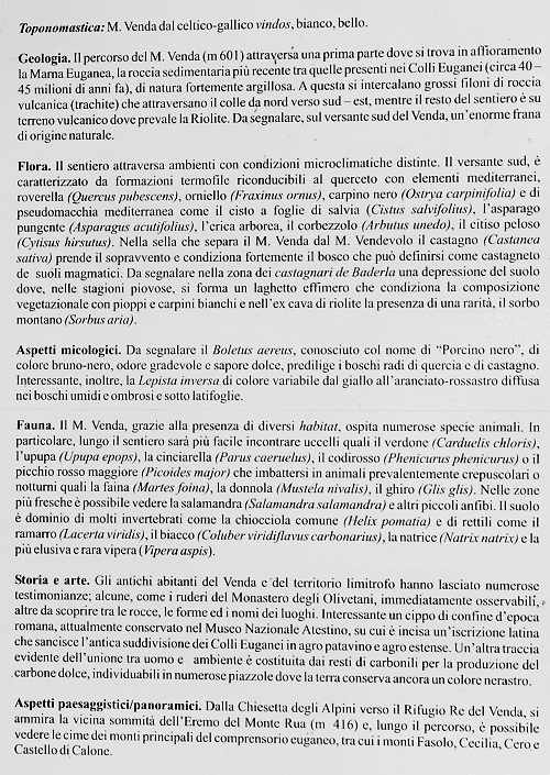 Al passo - Passo del Roverello m. 269 - si trova una piccola strada sulla destra che si deve seguire (c'è anche un cartello che indica rifugio Venda) dopo circa 1,5 km, sulla sinistra (poco prima della chiesetta), si trova via Sottovenda, piccola strada asfaltata, da percorrere per 500 metri e dove si parcheggia a 'Casa Marina', centro informazioni del Parco Colli Euganei.