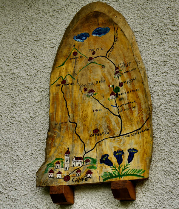 Dalla chiesa di Campo seguire la strada asfaltata per Schievenin, superate le case e un primo incrocio la strada dirige verso la valle del Tegorzo e ad un curvone verso sinistra, appena dopo un antico capitello, si dirama sulla sinistra una stradella in salita asfaltata (circa 800 m. dalla chiesa).