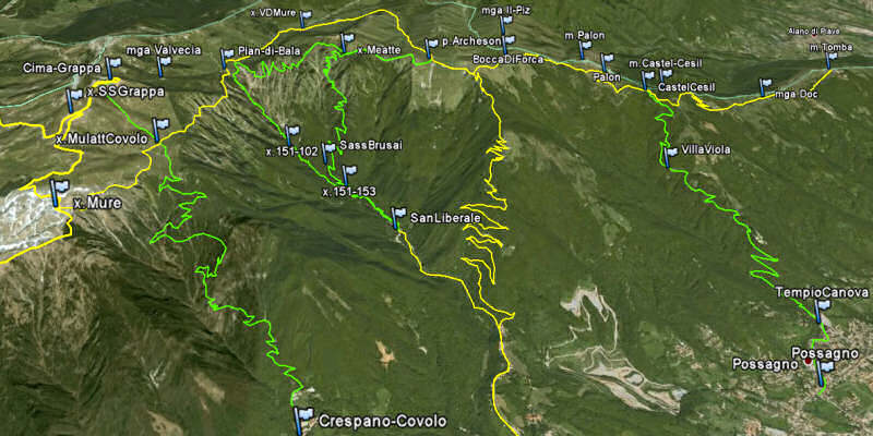 | San Liberale | cima Grappa | 151 | 3:30 | 1.770 | 1.100 | escursionistico, lungo e con tratti ripidi faticosi, ma non difficile, panorami spettacolari | sbocca al 'Pian di Bala', testata della Val delle Mure, poi a sinistra qualche centinaio di metri per la strada e quindi sulla destra salita alla cima |