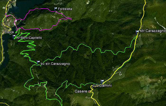 Ancora un tratto nel bosco e si trova un bivio (m.740), con una strada che (a tornante) svolta a destra, mentre la principale (anche se sembra meno importante) tira diritto sull'alta val Carazzagno.