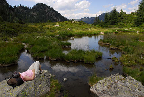 laghetto di Agnelezza (m.1940), residuo di una più vasta torbiera al centro dello slargo del terrazzo superiore della valle glaciale circondato da estesi macereti di enormi massi di porfido.