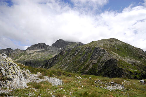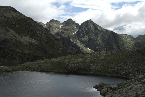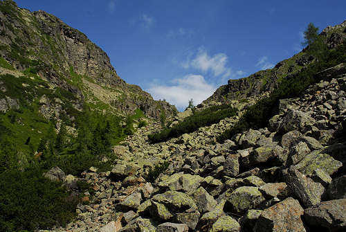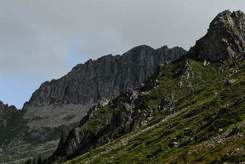Si attraversano le alte balze rocciose dalla Val di Fumo, la Tombola Nera, per raggiungere il bivio sotto la Cima delle Buse Todesche, nell'alto vallone Vendrame.