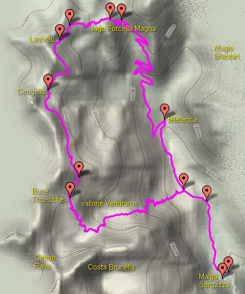 La partenza è da malga Sorgazza, in alta Val Malene, si sale a forcella Magna per la facile mulattiera, si scende lungo l'impervio vallone Vendrame per sentiero molto ripido e abbastanza duro.