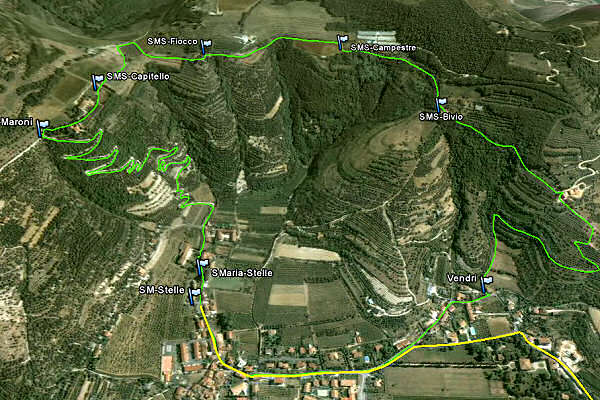 Verso destra si scende direttamente alla parrocchiale di Santa Maria in Stelle, verso sinistra si amplia il giro scendendo alla chiesetta di Vendri.