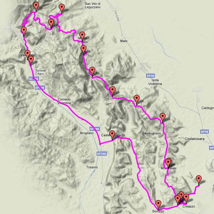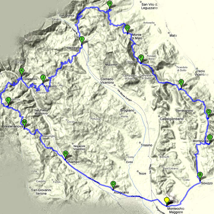 Mucchione, Monte Magrè, passo Zovo, Valdagno, valico Santa Caterina, Altissimo, Crespadoro, Bolca, Vestenanova, Chiampo, Arzignano, Montecchio Maggiore.