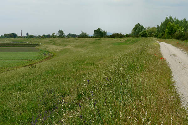 Oltre il ponte svoltiamo a destra lungo via Casoni Nuovi e raggiungiamo l'argine del Bacchiglione, ormai siamo arrivati nei pressi dei grandi edifici della Corte Benedettina.