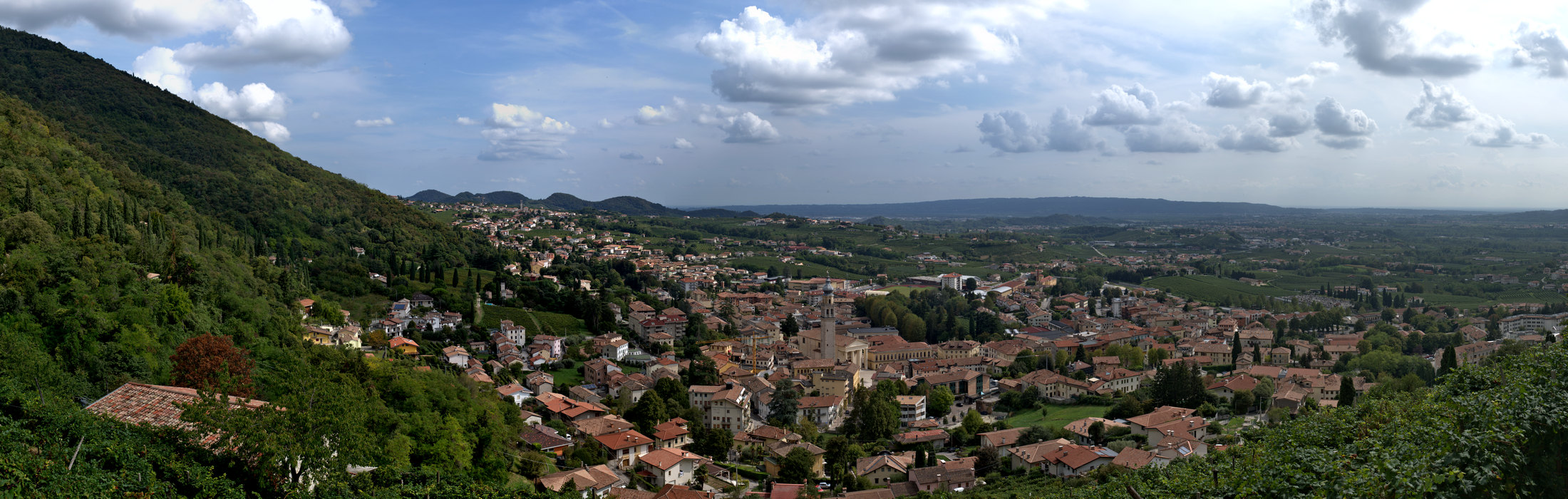la conca di Valdobbiadene (Treviso), ai piedi del monte Cesen con le colline del Prosecco e del Cartizze.