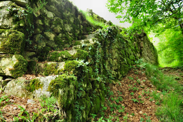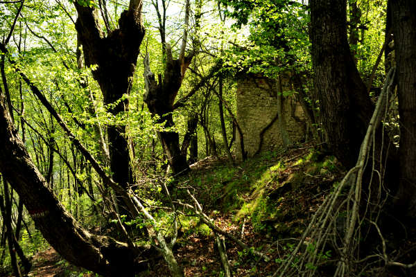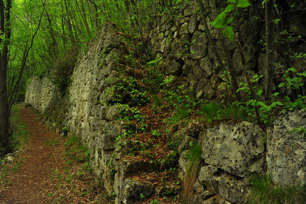 Il sentiero selciato si fa subito ripido e con diversi tornantini per entrare in una valletta (Val dei Mori), dove troviamo la diramazione AVT sulla destra (m.325), lasciamo il sentiero n.781 e attraversiamo l'impluvio presso i ruderi di una casetta.