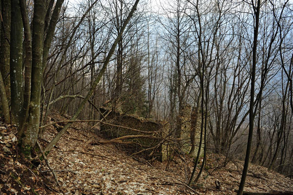 Lasciato il sent.775 si scende sul versante nord della ardita cresta del Col d'Astiago e si procede per tracce nella fitta boscaglia fino ad una selletta oltre la quale si trovano alcune vecchie case (case Geremia).