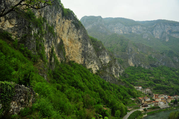 La veduta, dopo gli spendidi colpi d'occhio sulle dirimpettaie case Giaconi, si sposta sulla sottostante Valstagna, proprio sotto i piedi 150 metri più in basso.
