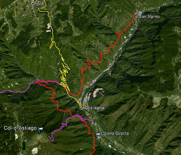 Dopo il tratto impegnativo riprende il sentiero di traversata, incrociamo (m.330) il sentiero Cai n.783 (per il Sasso Rosso) e proseguiamo alti sopra il borgo Sasso Stefani e il borgo di Giara Modon fino a giungere alla profondissima incisione della Val Gadena dove raggiungiamo la stradina sterrata allo sbocco della forra.