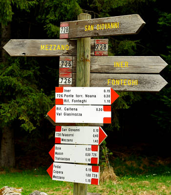 Località Poit di Mezzano si raggiunge con una ripidissima e strettissima stradina asfaltata, nei pressi si trovano piccole piazzole dove parcheggiare. Consigliabile autista esperto di stradine di montagna. Dalla terza rotonda sulla tangenziale del Primiero (provenendo da Feltre), nei pressi di Mezzano, si esce a destra (indicazioni Val Noana) e subito dopo si svolta a sinistra per una stradina che costeggia il torrente Cismon fino a raggiungere le case di Oltra Copèra. Verso destra si segue la stradina principale che inizia subito a salire. La salita è molto ripida, con tratti al 20%, con numerosi tornanti, stretta e dove passa solo un mezzo vi è qualche piazzola per manovra. Seguire sempre la stradina asfaltata principale e le indicazioni per Prati di San Giovanni. Dopo circa 4,5 km di salita, poco prima di raggiungere Poit, una specie di valico verso la Val Noana (una sola casa poco oltre) e dove si dirama a sinistra la stradina per rifugio Caltena, si trova la diramazione (sulla destra) di una stradina e si nota un cippo e cartello del sentiero del Monte Cordognè. Nei pressi, sulla sinistra, si trovano lungo la strada un paio di piazzole dove possono parcheggiare alcune auto. Naturalmente l'inizio del sentiero si può raggiungere a piedi da Oltra di Mezzano per alcuni sentieri e/o la strada. Sono circa 500 metri di dislivello e 4 km. Da Poit, sul valico, verso sinistra si dirama una stretta stradina che raggiunge in 2 km. il noto rifugio Caltena. L'escursione può essere effettuata anche dal rifugio Caltena. Rifugio, molto frequentato, che si raggiunge per una ripidissima, tortuosa e stretta stradina asfaltata che parte di fronte al Municipio di Transacqua. Anche questa stradina non è da meno della stradina diretta per Poit, ed è consigliabile ad autisti esperti di stradine di montagna. |