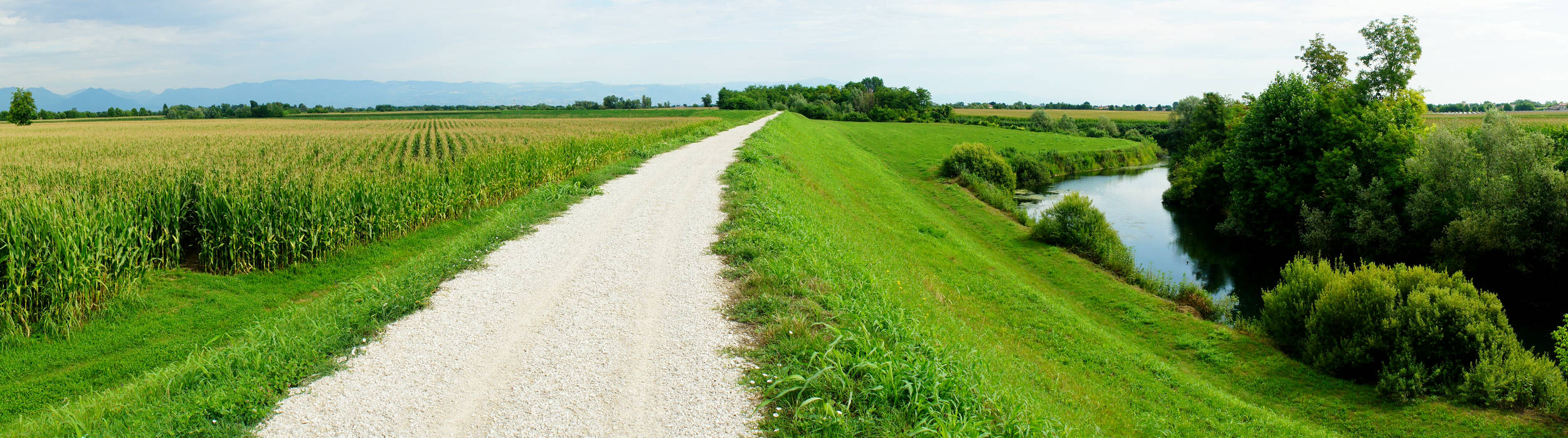 argine del fiume Tesina a Torri di Quartesolo, sullo sfondo il monte Summano e l'Altopiano di Asiago