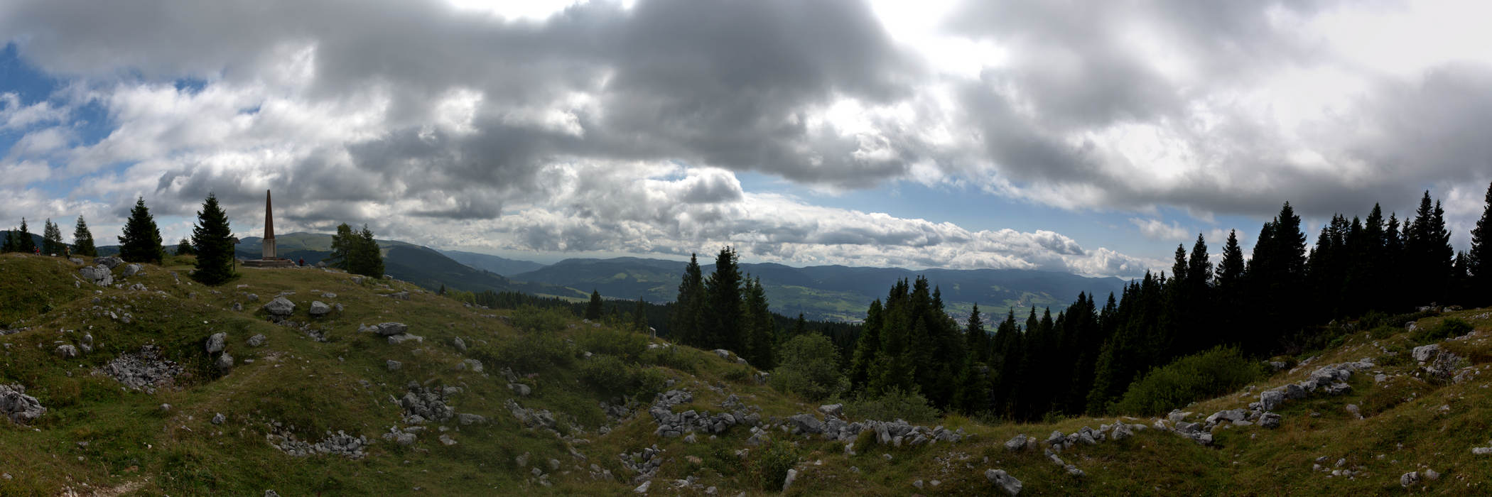 Monumento sulla Mina dello Scalambron al Monte Zebio, in basso a destra la piana con Asiago, museo all'aperto delle trincee e della grande guerra