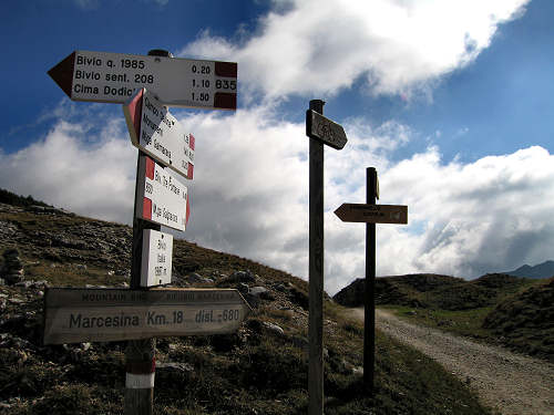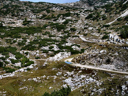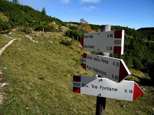 Si può percorrere integralmente la stradina (Kaiser Karl Strasse) fino al Bivio Italia, oppure dopo la prima rampa, alla Busa della Pesa, salire (sinistra, più consigliabile) per il sentierino che s'inoltra tra i mugheti, passa nelle vicinanze del bivacco Tre Fontane (ex rifugio) e raggiunge il misero e sperduto baito di Bivio Italia Cima Dodici (bivacco di emergenza sempre aperto).