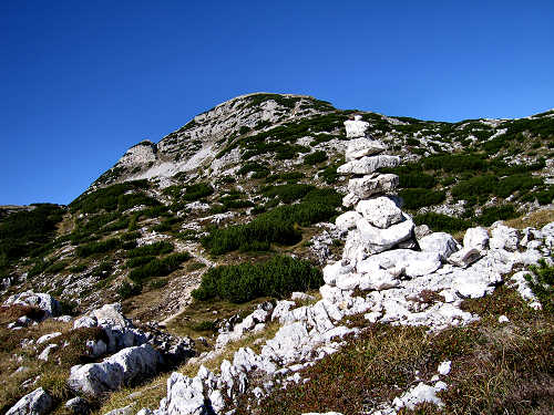 Dal Bivio Italia si scende per un po' lungo la stradina verso i Campigoletti e l'Ortigara, quindi ad un successivo bivio (quota 1985)(sinistra) si prende una traccia di mulattiera che attraversa un'ampia area carsica e mira alla cima.