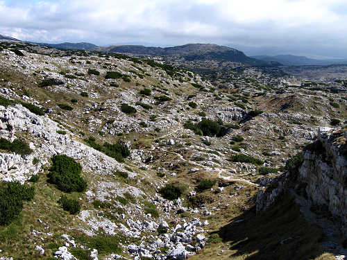 L'ambiente è molto desolato, dominano grandiosamente le caratteristiche carsiche. Vi sono vasti campi rocciosi intervallati da profonde doline, numerosi si aprono pozzi e grotte, oltre ai ricoveri scavati durante la guerra. La vegetazione è formata quasi esclusivamente da estesissimi, ed intricati, mugheti.