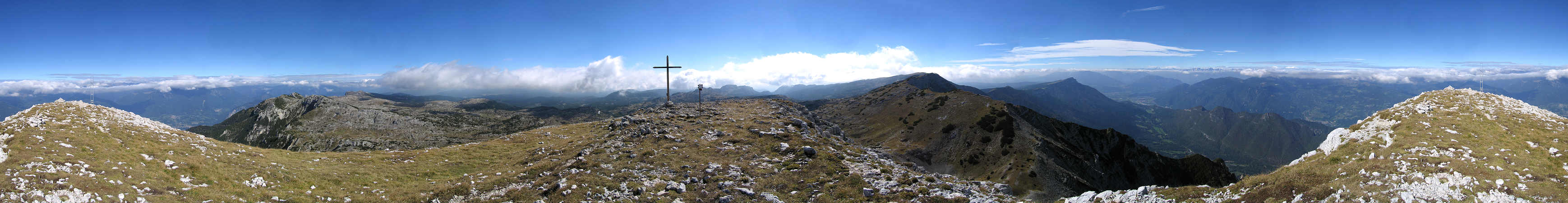 Da sinistra a destra: la croce di Borgo Valsugana, il Monte Ortigara, i Campigoletti, la croce di legno della vetta, cima Trentin, il Portule, Pizzo Vezzena, la Valsugana con i laghi di Levico e Caldonazzo con sotto la Val di Sella, Borgo Valsugana, la Panarotta e i Lagorai.