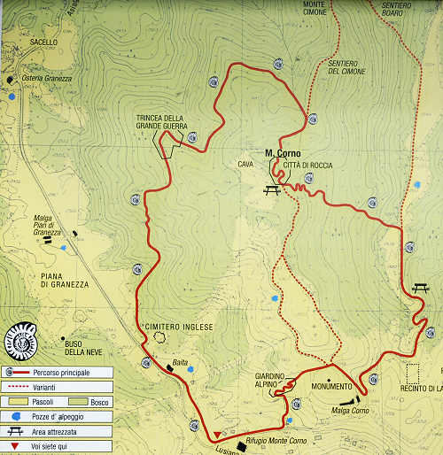 Si può percorrere un interessante anello storico/naturalistico che conduce alle trincee del Monte Corno, al cimitero militare Inglese e al monumento al Partigiano partendo dal piazzale del rifugio Monte Corno.