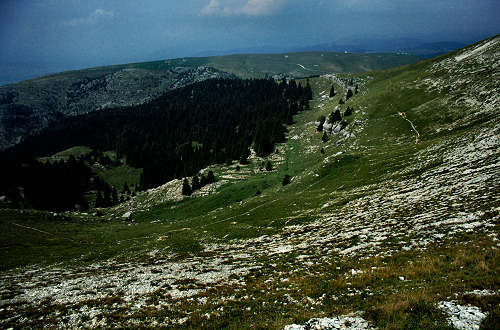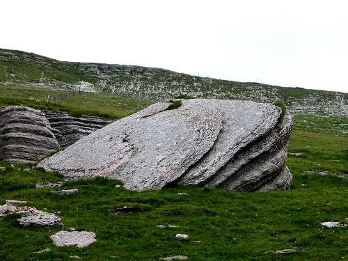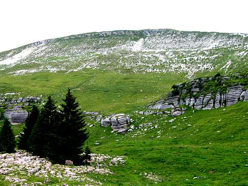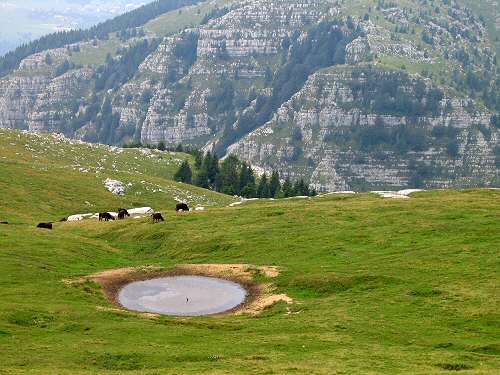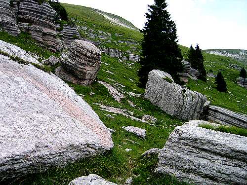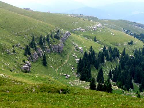 Ancora tra tracce di pascolo, reticolati che suddividono le aree di pascolo, buche di granate, scavi di trincee raggiungiamo il prativo monte Fior (m.1824).