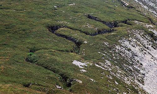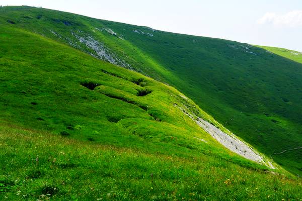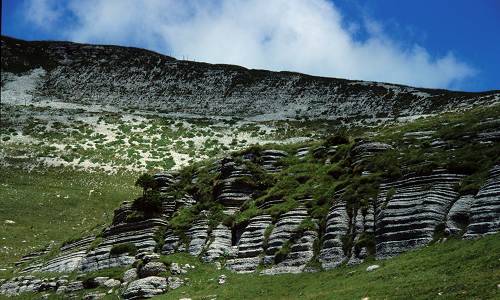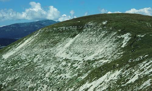 Le bancate rocciose di calcare, trovandosi a quota più bassa, riemergono nella cosidetta 'Città di Roccia', mentre il colmo di cima si presenta come una regolarissima gobba erbosa.