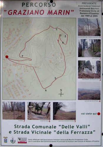Romano Alto (Romano d'Ezzelino - Vicenza)Romano Alto si trova a poca distanza da Bassano del Grappa, proprio dove parte la strada "Cadorna" che sale a Cima Grappa.Si raggiunge facilmente dalla superstrada della Valsugana seguendo le indicazioni dell'uscita per Cima Grappa. Un parcheggio per effetturare la passeggiata si trova a poche decine di metri dalla rotonda principale, proprio dietro la chiesa e la canonica, a pochi metri dal cartello che indica la partenza del percorso. |