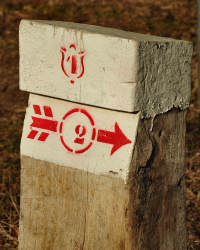 Un cippo con le segnalzioni "1" (sentiero) e "2" (numero progressivo) indica con chiarezza la direzione della nostra breve escursione.