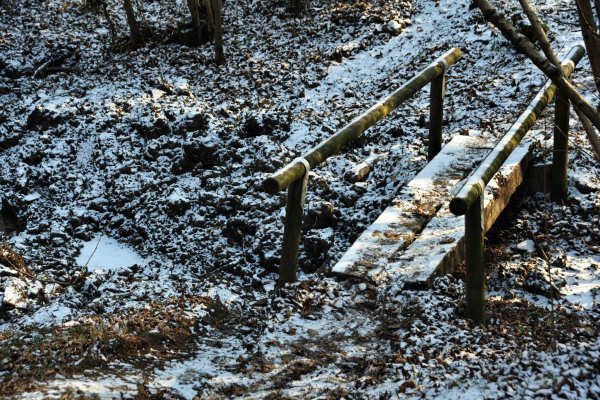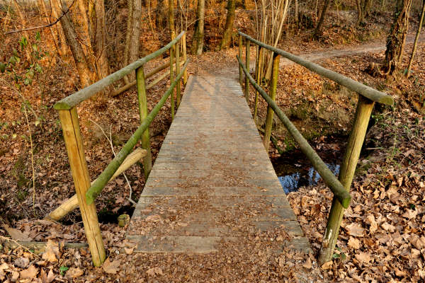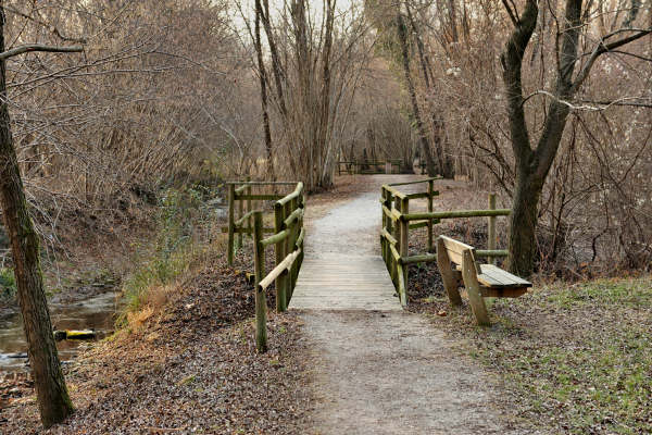 Ora si segue integralmente la stradina sterrata, a tratti ampio sentiero, con alcune panchine e ponticelli di legno, fino a sbucare all'inizio della salita della strada del Santuario.