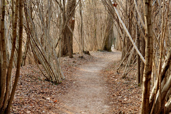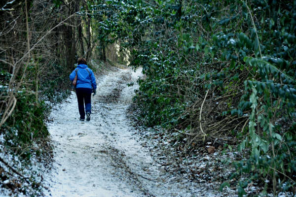 Imboccare la strada asfaltata in leggera salita del Santuario fin dove ad una curva la salita s'impenna tra il filare di cipressi e dove si trova un piccolo incrocio con, a destra, la stradella sterrata della Valle della Rù.