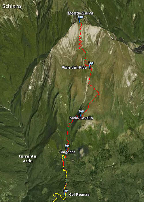 Partendo dal Col di Roanza, alla periferia di Belluno e alla modesta quota di 800 metri (la cima è a m.2.133), si sale lungo la stradina fino al 'Cargador' dove parte il sentiero 517.