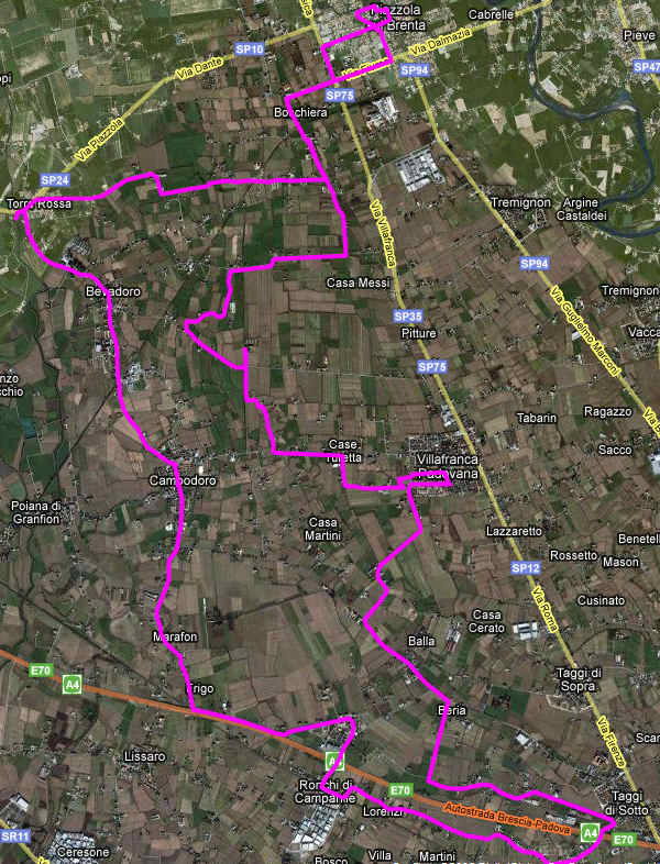 | Villafranca Padovana | Taggì di Sotto | 6,0 | 40,5 | per la pista ciclabile raggiungere Villa Maschio, proseguire fino a giungere alla provinciale Taggì-Campodoro, svoltare a sx