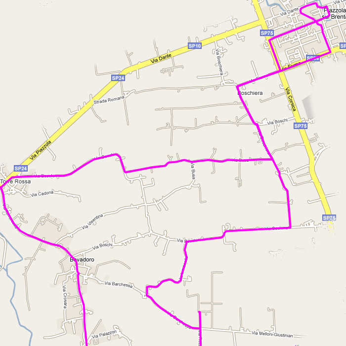 | Piazzola sul Brenta | Boschiera | 3,0 | 27,5 | ritornare a Boschiera e proseguire verso sud fino all'incrocio dove si era usciti all'andata |