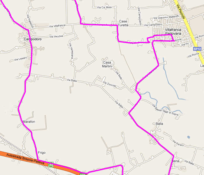 | Barchessa | Villafranca Padovana | 1,5 | 34,5 | ripercorso il rettilineo fino all'incrocio, proseguire dritti verso sud, alla prima strada sx, curve, si sbuca sulla provinciale