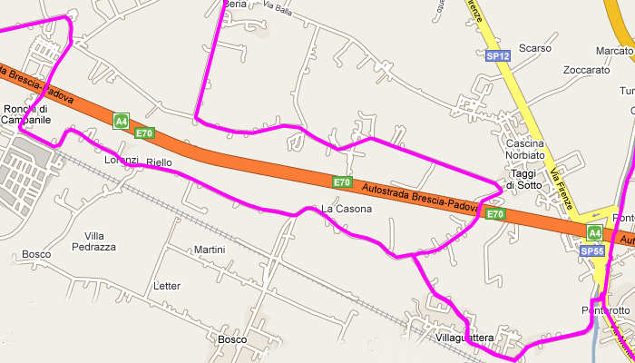 | Ronchi Campanile | Campodoro | 5,5 | 12,0 | giunti al passaggio a livello dx, sovrapasso autostrada, piazza, girare dietro la chiesa, proseguire poco lontani dall'autostrada,