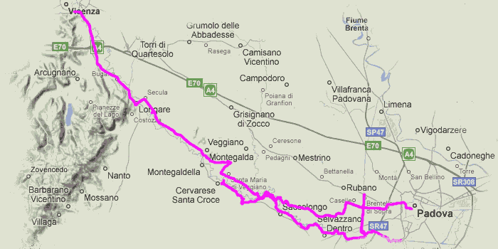 Problema: andare da Vicenza a Padova (o viceversa) in bicicletta da corsa o cicloturismo con bagaglio, per strade asfaltate, senza fare follie lungo la Statale 11 "Padana Superiore".