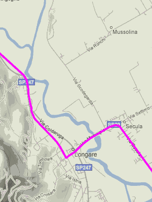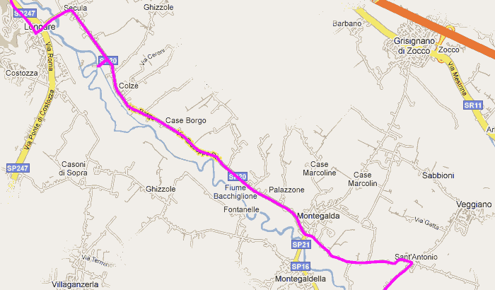 | Longare | Secula | 1,0 | 10,2 | attraversare il semaforo (direzione Montegalda, Padova), ponte sul Bacchiglione, svolta per Secula |