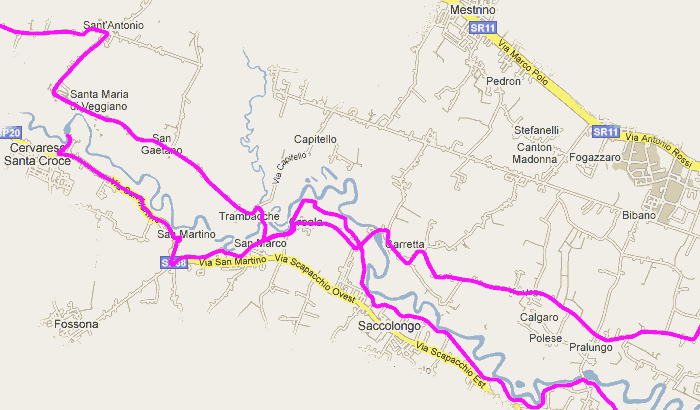 Un paio di chilometri difficili e pericolosi lungo la storica "Strada Pelosa" (cercasi alternative o interventi pubblici risolutivi) per raggiungere il nuovo ponte ciclo-pedonale sulla Brentella (aperto nel settembre 2008) per passare in comune di Padova.